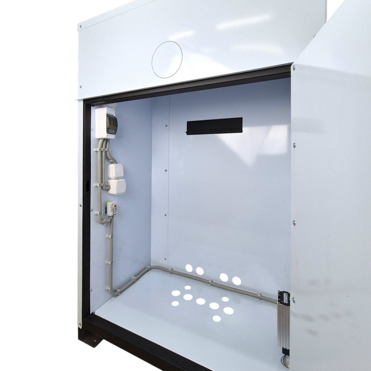 Термобокс оснащен электрическим теном и термостатом мониторинга температуры внутри. Бокс изготовлен из специальных Сендвич панелей с утеплением 40 мм, предназначен для эксплуатации в условиях умеренного климата в соответствии с условиями умеренного и холодного климатов при предельной рабочей температуре от +40 до -40 градусов.