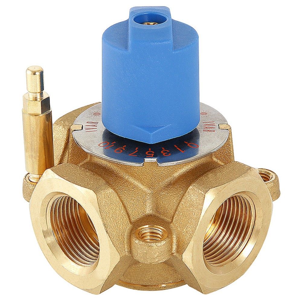 (VT.MIX03.G) Предназначен для использования в смесительных и разделительных узлах гидравлических систем. Управление клапаном может осуществляться вручную или с помощью сервопривода с крутящим моментом не менее 5 Н•м (рекомендуется модель VT.M.106). Корпус и регулирующий элемент выполнены из латуни, что исключает возможность появления коррозионных отложений в рабочих зазорах. Уплотнение штока достигается с помощью двух колец из синтетического каучука EPDM PEROX. При этом верхнее кольцо легко заменить без полной разборки изделия. Клапан ремонтопригоден и состоит всего из четырех основных деталей, что повышает его надежность. Максимальная рабочая температура теплоносителя – 120 °C, нормативное давление – 10 бар. Резьба присоединений – внутренняя. Условные диаметры предлагаемых моделей – 3/4, 1, 1 1/4". Ручка управления входит в комплект.