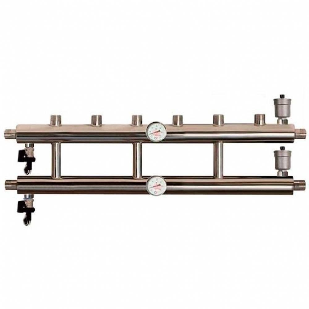 Состоит из подающего и обратного коллекторов, расположенных друг над другом. Коллектор значительно упрощает и ускоряет монтаж системы отопления, это готовое изделие с минимумом разборных соединений значительно повышает надежность системы.