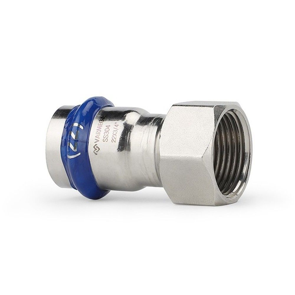 Муфта с внутренней резьбой Varmega Inox Press с одной стороны имеет раструбное соединение для трубы, а с другой стороны фитинга находится внутреннее резьбовое соединение. Данный фитинг позволяет присоединить к трубопроводу различные резьбовые элементы (краны, фильтры и т. п.), также дает возможность подключиться к другому типу трубопровода. Для получения надежного неразъемного соединения трубы и фитинга потребуется специальный пресс-инструмент с насадками типа профиль «V».