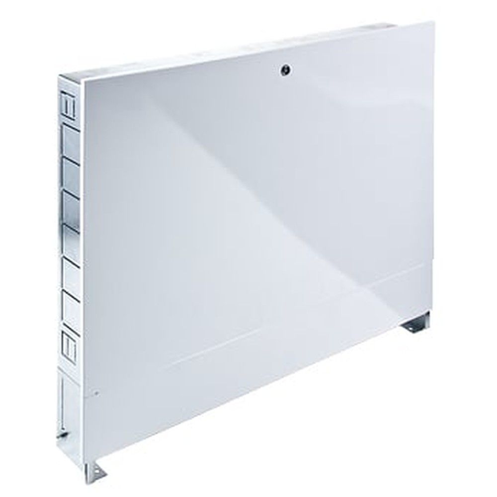 (VTc.540.0) Встраиваемые коллекторные шкафы (распределительные шкафы) VALTEC VTc.540 предназначены для размещения в них коллекторов и коллекторных блоков систем внутреннего водопровода и отопления, а также смесительных узлов для водяного теплого пола VT.COMBI и VT.DUAL. Монтаж шкафа осуществляется в стенной нише. Детали шкафов коллекторных VALTEC выполнены из оцинкованной стали. Лицевые поверхности окрашены порошковой эмалью цвета RAL 9016 с предварительной фосфатной подготовкой поверхности. В боковых стенках корпуса выполнена перфорация, сегменты которой удаляются в месте, удобном для пропуска присоединяемых трубопроводов. Выдвижные ножки дают возможность регулировать высоту шкафа от 670 до 760 мм. Ножки имеют отверстия для крепления шкафа к полу. Откидная дверца имеет замок, защищающий установленное в шкафу оборудование от несанкционированного доступа. Внутри шкафа установлены передвижные монтажные рейки, к которым крепится оборудование. Встраиваемые коллекторные шкафы VTc.540 оснащены выдвижной рамкой, которая позволяет регулировать глубину установки от 125 до 195 мм, и могут закрепляться в нише с помощью отгибных фиксаторов.
