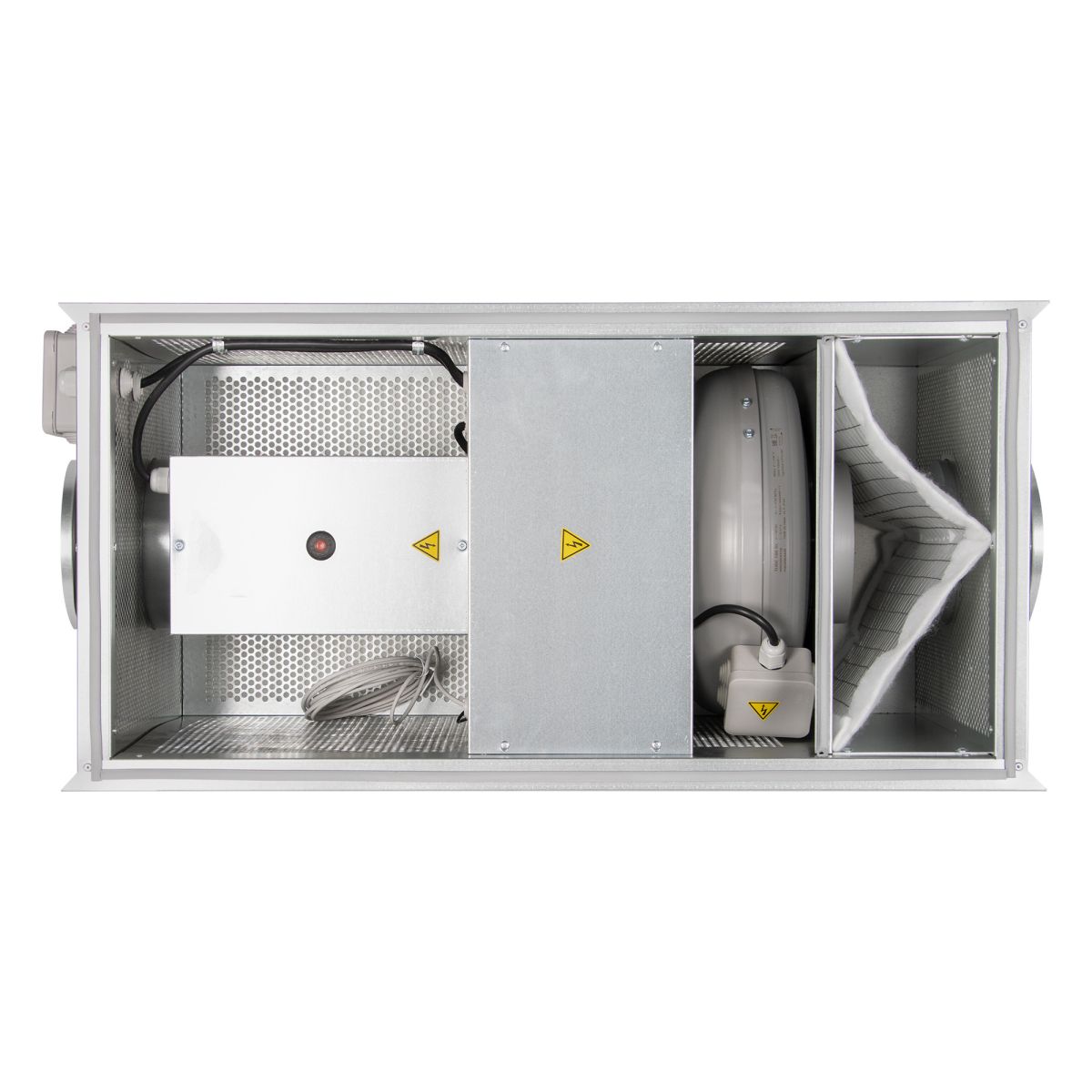 Приточная установка оснащена фильтром класса EU5, электрическим нагревателем с ТЭНами из нержавеющей стали и вентилятором. Вентилятор оборудован асинхронным двигателем с внешним ротором и не требующими обслуживания уплотненными подшипниками с увеличенным сроком службы. Защита двигателя вентилятора осуществляется встроенными термоконтактами. Трехфазные электрические нагреватели оснащены двухступенчатой защитой от перегрева. Первая ступень настроена на 50°С и перезапускается автоматически, вторая ступень настроена на 100°С и перезапускается вручную.